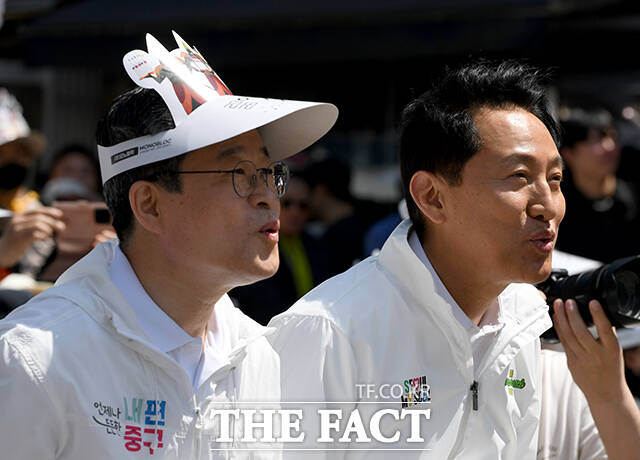 [더팩트 | 박상민 기자] 오세훈 서울시장(오른쪽)과 김길성 서울 중구청장이 25일 오후 서울 중구 명보아트홀 앞에서 열린 2026 이순신 축제에 참석해 이순신 장군의 생일 촛불을 부는 퍼포먼스를 하고 있다.