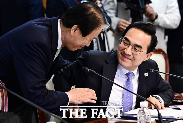 [더팩트ㅣ임영무 기자] 박홍근 기획예산처 장관(오른쪽)과 권오을 국가보훈부 장관이 27일 오후 서울 종로구 정부서울청사에서 열린 국가보훈위원회 회의에 참석해 인사를 나누고 있다.