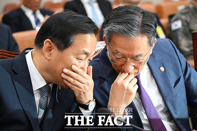 [더팩트ㅣ국회=남용희 기자] 이두희 국방부 차관(왼쪽)과 정성호 법무부 장관이 28일 오전 서울 여의도 국회에서 열린 윤석열 정권 정치검찰 조작 기소 의혹 사건 진상규명 국정조사특별위원회 전체회의에서 대화를 나누고 있다.