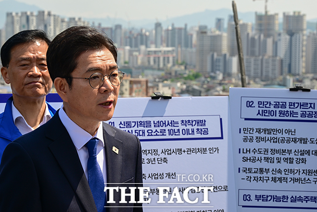 [더팩트ㅣ남윤호 기자] 정원오 더불어민주당 서울시장 후보(왼쪽 두 번째)가 29일 오전 서울 성북구 장위동의 한 아파트 옥상에서 부동산 정책 발표를 하고 있다.