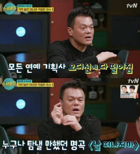한편 과거 박진영은 tvN 예능프로그램 '인생술집' 등 다수의 방송에 출연해 SM 오디션과 관련된 에피소드를 털어놨다. 그는 "당시 모든 소속사 오디션에 다 떨어졌다"라며 "오디션을 보고 나가는데, 이수만이 '(날 떠나지 마) 너 그 곡 안 팔래?'라고 물었다. 내 인생에 가장 슬펐던 날이었다"라고 고백해 화제를 모았다.