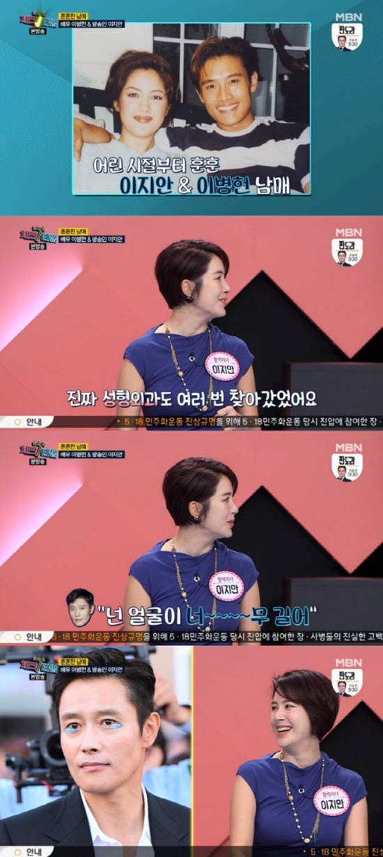 이어 김국진은 "이병헌 씨 때문에 성형수술을 해야 하나 고민했다고 하더라"고 언급했고, 이지안은 "제가 성형외과를 여러 번 찾아가 봤다. (이병헌이) 하도 제 얼굴이 길다고 놀렸다. 매일 실베스터 스탤론, 니콜라스 케이지 닮았다고 놀렸다. 그래서 어린 마음에 상처받고 성형외과를 찾아갔다. 의사 선생님께 제 얼굴 잘라주면 안 되냐고 했다. 그런데 불가능하다고 하더라"고 고백했다.