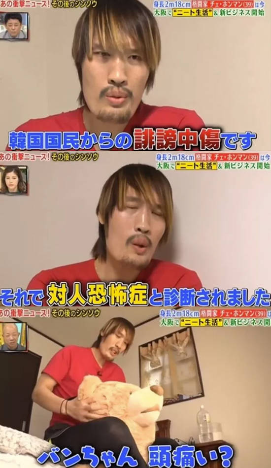 최홍만은 지난해 8월 일본 TBS 예능 '오늘 밤 해금'이라는 프로그램에 출연해 악플로 인한 상처를 고백했다. 그는 당시 일본 오사카에 거주하고 있었으며 무직자인 '니트족'으로 소개됐다.