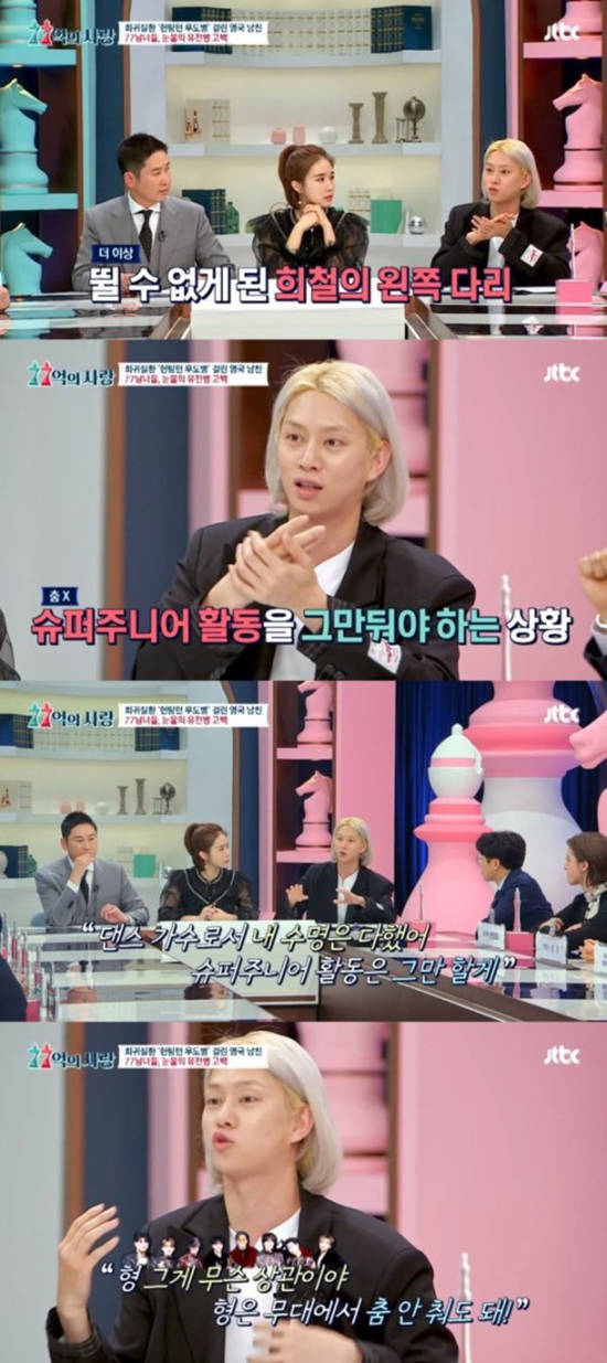 이에 대해 김희철은 "나는 영국 남자의 사연에 공감한다. 비유가 맞는지 모르지만 내겐 슈퍼주니어가 여자친구라고 하고 이야기를 하겠다"고 운을 뗐다. 김희철은 "14년 전에 큰 교통사고가 나서 내 왼쪽 다리가 완전히 부서졌다. 춤을 추면 나중에 정말 못 걷게 될 수도 있다는 말까지 들었다"고 말해 충격을 안겼다.
