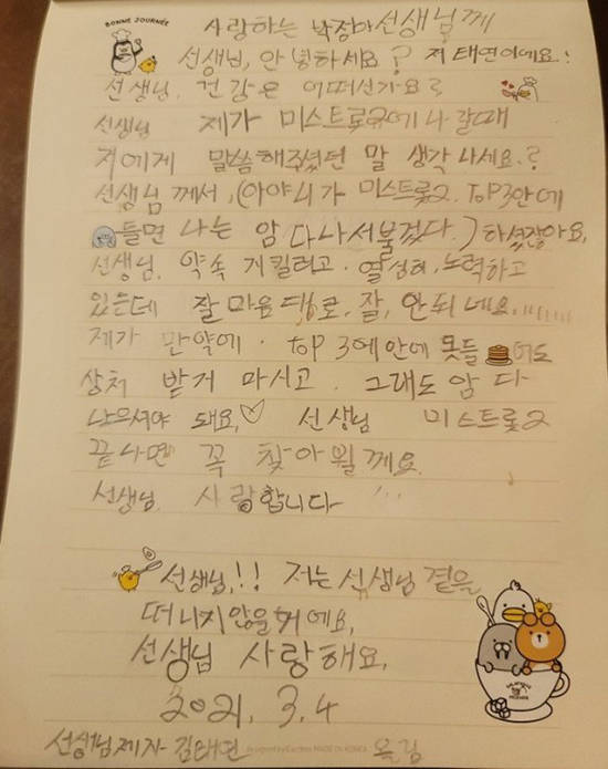 사진에는 김태연이 판소리 스승인 박정아 명창에게 쓴 손편지가 담겼다. 박정아 명창은 현재 유방암으로 투병 중이다. 편지에서 김태연은 "제가 '미스트롯2'에 나갈 때 저에게 말씀해 주셨던 말 생각나세요? 선생님께서 '아야. 네가 '미스트롯2' 톱3 안에 들면 나는 암 다 나서불겄다' 하셨잖아요"라고 적었다.