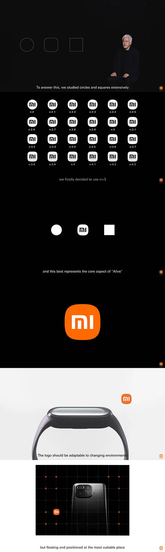 샤오미의 '미'(米)를 영어로 쓴 'mi'는 그대로 둔 채, 기존 사각형 테두리를 원형으로 바꾼 것이다. 레이쥔 CEO는 로고 변경을 2017년부터 추진했고, 마침내 일본 유명 디자이너 겐야 하라의 도움을 받아 새로운 디자인을 만들어냈다고 설명했다.
