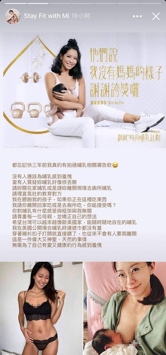 대만에서 23만 명 이상의 팔로워를 보유하고 있는 인플루언서 미셸은 최근 페이스북에 막내 아들의 모유 수유 사진을 공유했다. 사진 속 미셸의 모습은 셋째 아들이 젖을 먹고 있는 사진이다. 사진과 함께 미셸은 "(지난) 11일은 아들의 생일이지만 아빠와 할아버지의 생일이기도 하다"라며 "실제로 3대가 함께 생일 축하한다는 것은 축복받을 일이다"라고 말했다.