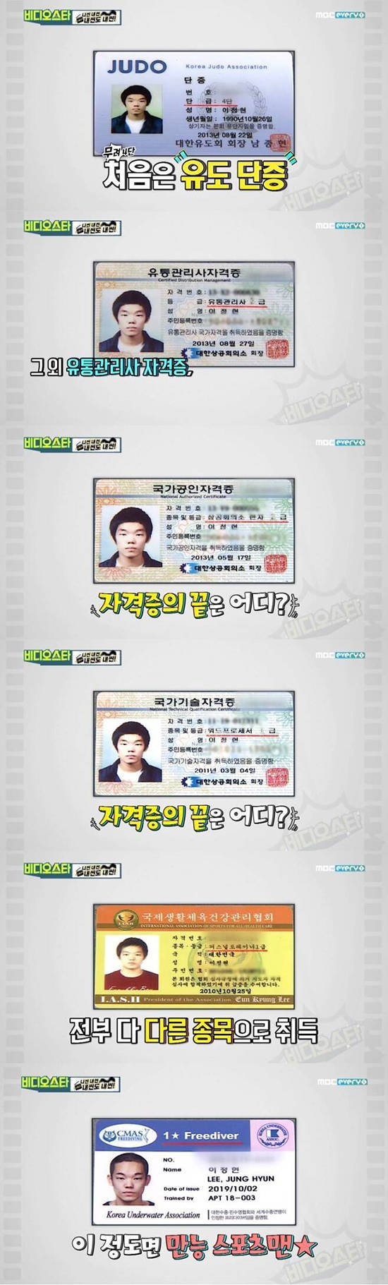 그는 "무명 배우 시절 연기만으로는 생계를 유지하지 어렵다고 판단했다"라며 "불안정한 미래를 대비하기 위해 각종 자격증을 취득했다. 유도와 태권도 단증은 물론 워드 프로세서, 유통관리사 자격증 등 자격증 종류만 12가지 정도다"라고 밝혀 놀라움을 자아냈다.
