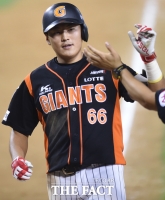 [TF포토] '정주현 끝내기 희생타' LG, 롯데와 난타전 끝에 승리